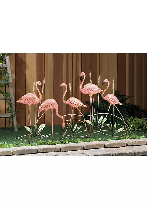 This fun metal garden stake features five flamingos hanging out in the catttails.