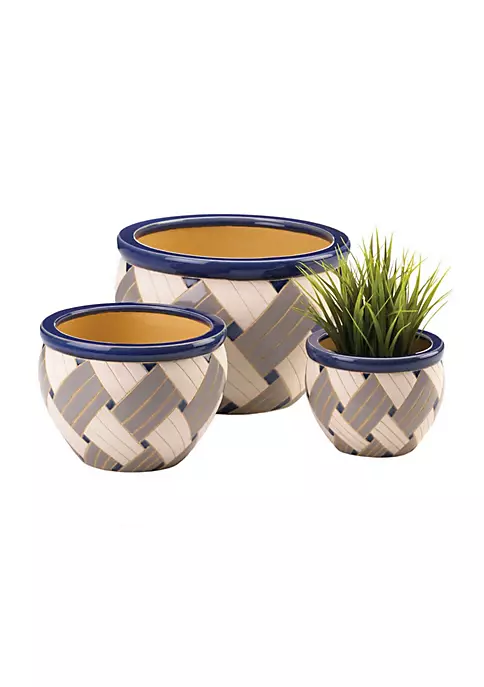 Durable ceramic planters feature a bold blue rim with a geometric woven design on the sides. Drain hole at bottom of each pot.