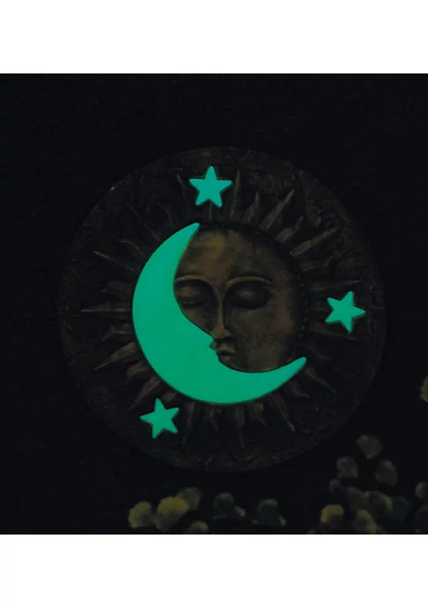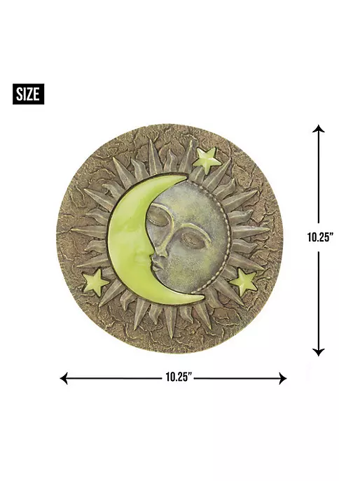 This unique Polyresin. stepping stone features the sun and a yellow crescent moon, along with a few stars. By day, the sun and moon are a beautiful work of art together. At night, the moon and stars will glow after soaking up some sunlight during the day. 3 pounds. 10.2 inches in diameter x 0.5 inch thick. Polyresin.