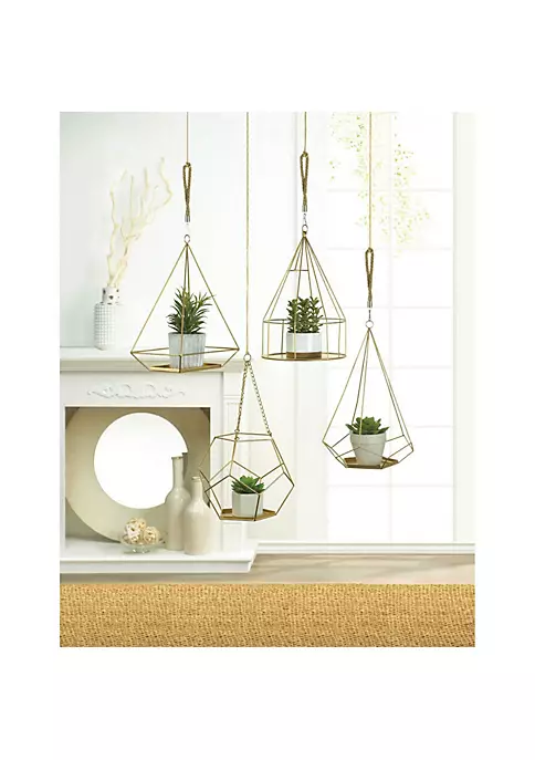 TThis geometric hanging plant holder will show off plants with a modern style. The hanging planter features a contemporary gold base and angular frame with a rope hook for a stunning balance of natural and modern design elements. This planter’s sleek gold frame will look stunning contrasting with the plant’s greenery. 1 pound. 10.5 x 7 x 14.75 inches tall. 24 inches tall including rope. Maximum weight limit 15 pounds. Iron and rope.