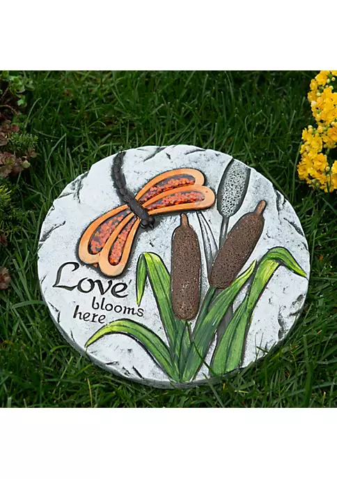 Charming stepping stone features an orange dragonfly with glittery wings enjoying his day near some cattails. Simple message says, “Love blooms here.” 3 pounds. 10 inches in diameter x 0.75 inch thick. Cement.