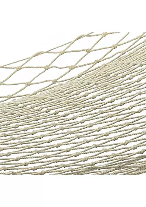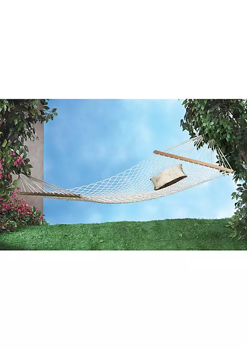Comfortable and cozy canvas hammock. Put one up your yard for an inviting spot to take an afternoon snooze. Max weight on hammock: 264 pounds. Weight 5 pounds. Recycled cotton, wood frame, rope for hanging. 47.25 x 106.25 inches.