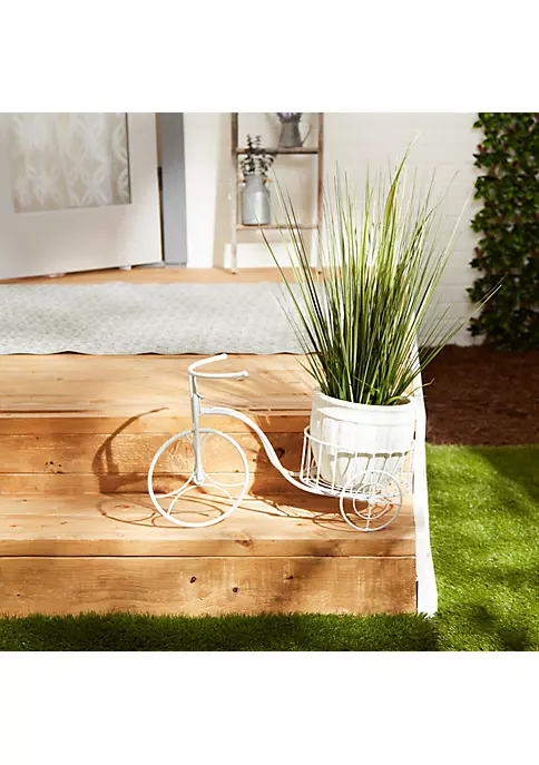 Metal planter looks like an old-fashioned tricycle. Holds a plant in the back, and the white makes a beautiful contrast with greenery or bright flowers. Display it indoors or outdoors.